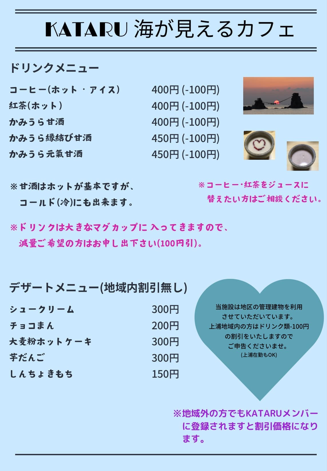 カフェは後期高齢者の方々を中心に運営されているため、通常のカフェのようなサービスが出来ない可能性が多々あります。皆様にご協力とご理解をいただけますと幸いです。